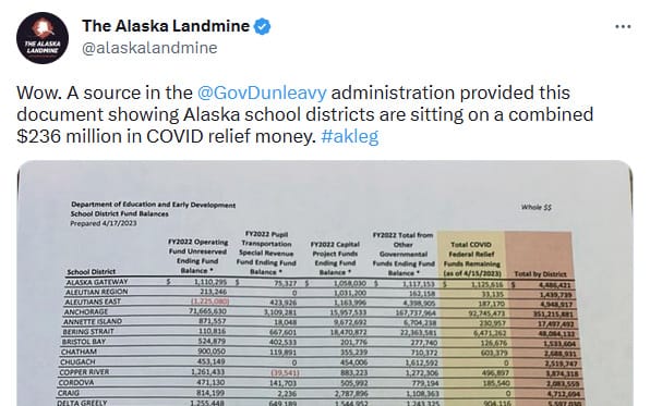 And the Dunleavy administration is fueling that notion with documents like the one above (link here), distributed just as the Legislature was really picking up steam on increasing education funding. Taken at face value, the sheet seems to suggest districts are flush with cash—identifying pots of covid money, budget reserves and money set aside for building and repairing schools—contradicting much of what we’ve heard from administrators and school advocates for the last several months.