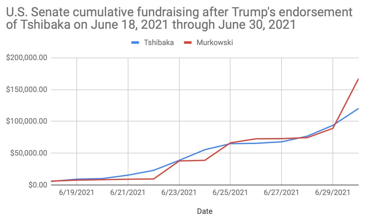What’s interesting is that the Trump endorsement doesn’t, according to the raw reports, appear to have resulted in a boon for Alaska returnee Tshibaka. Murkowski ever so slightly outpaced Tshibaka on the day the endorsement was delivered and significantly outpaced her by the end of the month. Here’s a quick crunch of the numbers I put together: