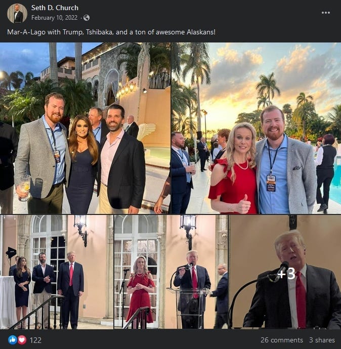 On social media, Church has posts celebrating the overturning of Roe v. Wade, attacking Alaska U.S. Sen. Lisa Murkowski for supporting the confirmation of Supreme Court Justice Ketanji Brown Jackson and several posts of right-wing news stories about Hunter Biden. He also has pictures of attending Mar-A-Lago when Trump hosted a fundraiser for Republican candidate for U.S. Senate Kelly Tshibaka.