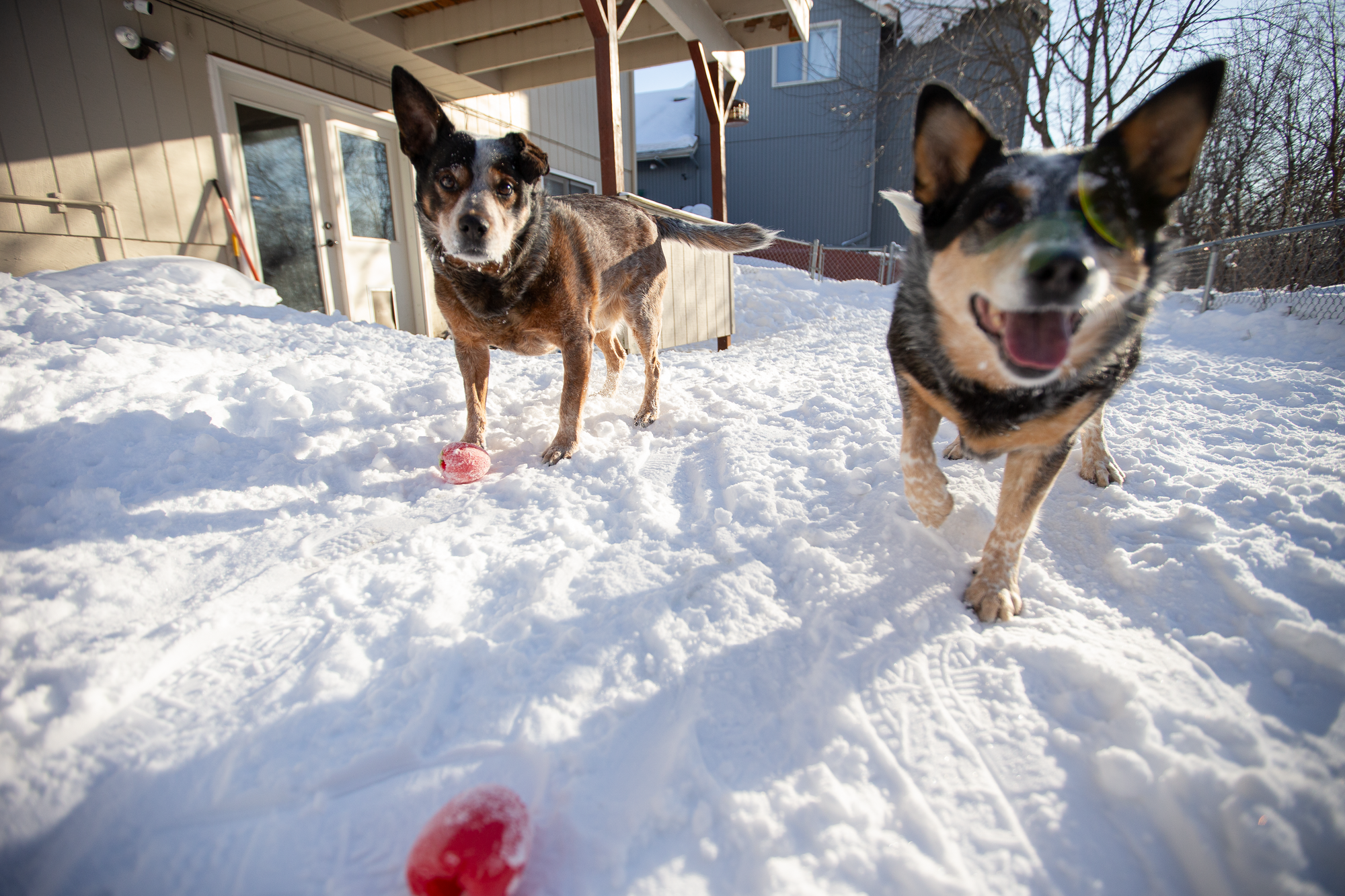 A common question. Tuco is the mostly red heeler with the Snoopy ear and Scout is the blue heeler/husky mix with a covetous streak.