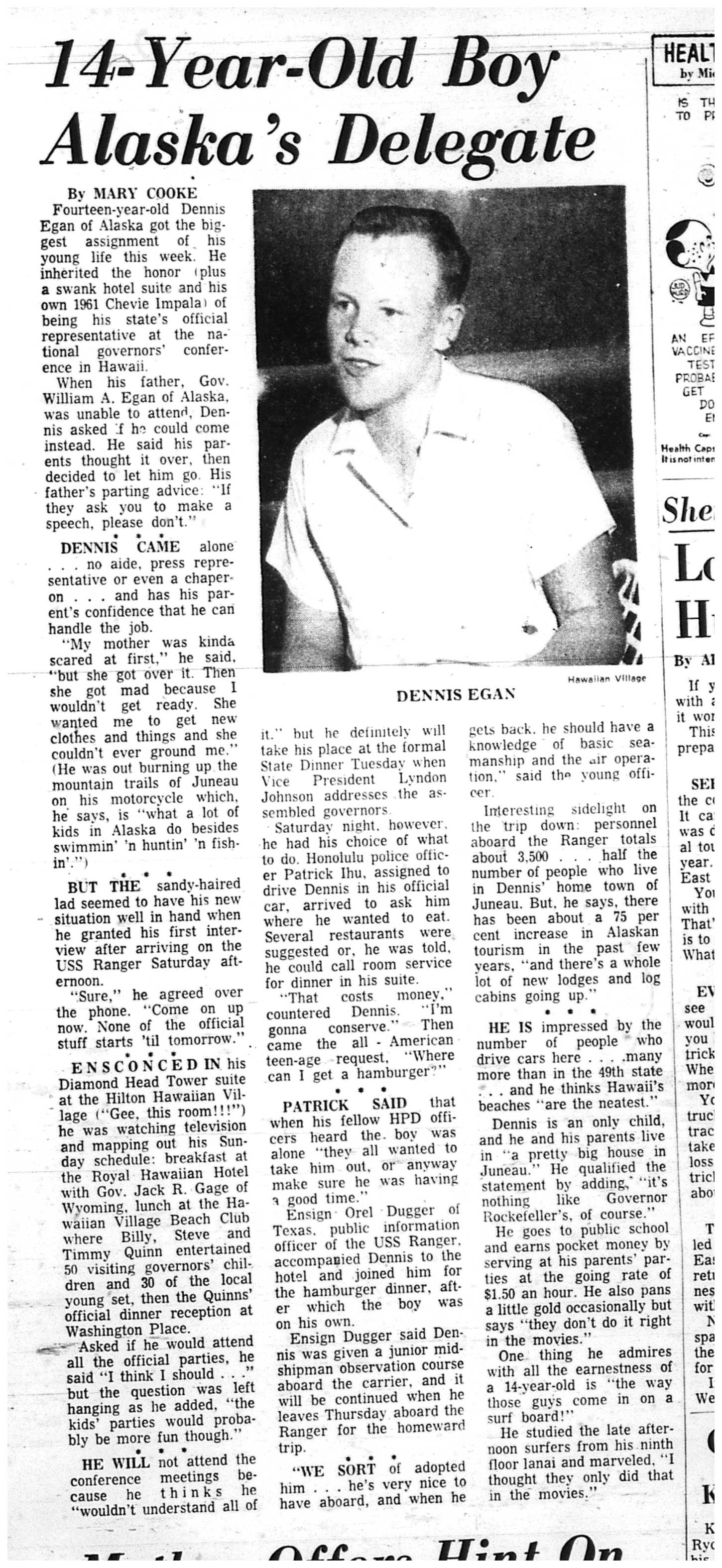 This news clipping of the time that 14-year-old future Sen. Dennis Egan was sent to represent Alaska at a national conference in Hawai’i was sent to me by reader Karen Hofstad (sorry it’s taken me so long to remember to put it in!).