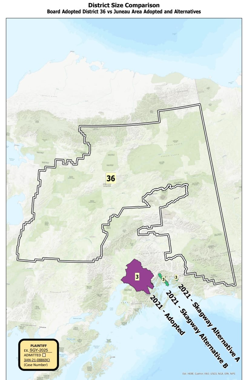 To make the point on both sides of the litigation, Brena presented this map that compares the board’s adopted district for Skagway against the alternatives drawn by his expert witness, Kimball Brace, and against the massive House District 36 that’s at issue in the Mat-Su/Valdez case: