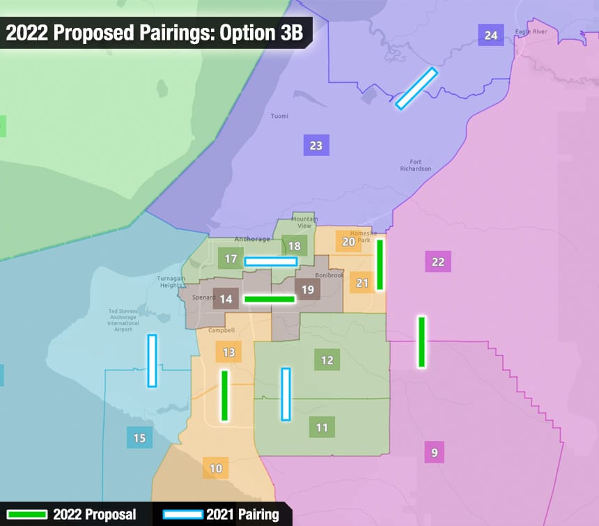 The other map that is being proposed comes from former Alaska Republican Party chair Randy Ruedrich as well as board member Bethany Marcum, whose comments that the original pairings would’ve given Eagle River the opportunity for “more representation” played a key role in the litigation. This map, which is called option 3b (it was reworked today to go from five changed districts to four) maintains the split of Eagle River, pairing the district that was previously paired with South Muldoon with the generally conservative South Anchorage/Girdwood district. Backers of it argue that the Eagle River and South Anchorage map is acceptable because the communities both have road service areas, fire dangers and bears. The areas don’t share any direct connection other than the Crow Pass trail that spans the Chugach Mountains that otherwise make it a roughly 30-minute drive through the rest of Anchorage to connect the two districts. Backers argue that shouldn’t matter as the Alaska Constitution only requires senate districts are touching. Many of those backers have also argued that their stout opposition to a similar arrangement during the Anchorage reapportionment process should have no bearing on their support for it now. This map is as follows: