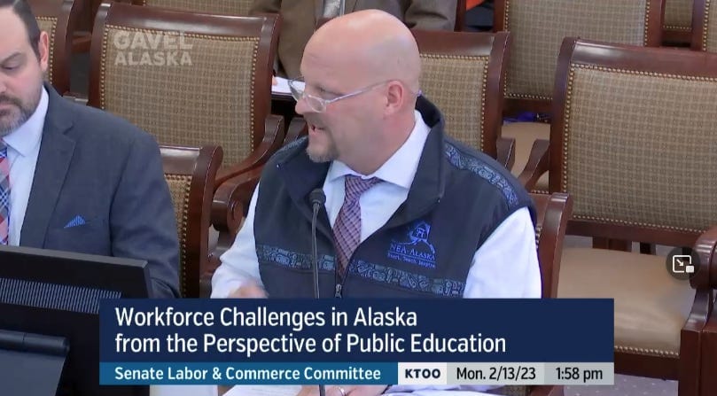 The issues with the retirement system have been ongoing since the change, but gained newfound attention this year as part of the Alaska Senate Majority’s key issues as they put retention and recruitment near the top of the session priorities. That’s included several hearings in Senate committees this session, including Monday’s meeting of the Senate Labor and Commerce Committee where they heard from NEA-Alaska, the Alaska Council of School Administrators and the Association of Alaska School Boards.