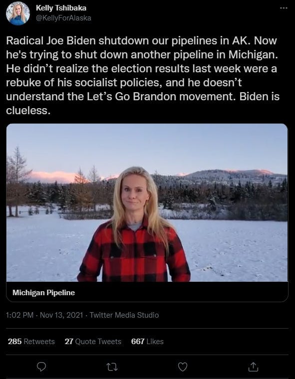 But perhaps what was most attention-grabbing for me is that far-right U.S. Senate candidate Kelly Tshibaka’s miserably awkward Twitter presence found a hit in parroting the far-right’s favorite swear-word stand-in. “He doesn’t understand the Let’s Go Brandon Movement,” reads her tweet in a nod to what has become a far-right in-joke meaning “Fuck Joe Biden,” which I wouldn’t exactly describe as a movement (more on that later), but has nevertheless done far better than of her previous “Liberal Lisa” postings.