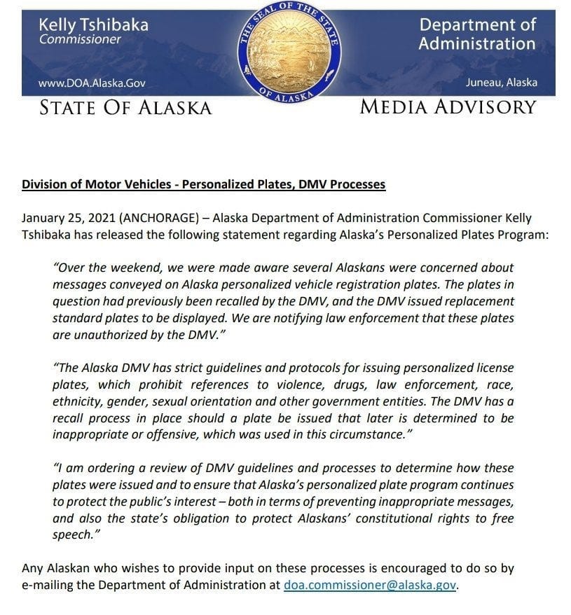 Monday was a largely quiet day in Juneau while much of Alaska’s political attention seemed to be still tightly focused on whether it’s OK to call pro-Nazi license plates bad (it is) or whether the First Amendment will come crashing down if we don’t defend a person’s right to glorify Nazis on a state-issued license plate (it won’t). And, hey, it turns out that those 3REICH and FUHRER plates were actually recalled by the state and the police have been notified there are unauthorized plates being used. Just how they were issued in the first place is unanswered, but the state says they’re working to get to the bottom of it. Here’s the statement from the Department of Administration: