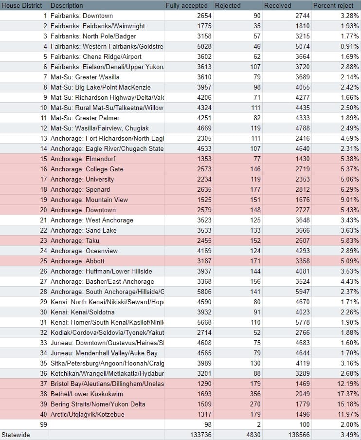 Alaska Public Media reporter Wesley Early pointed out that the highest rejection rate is in the Bethel house district along with several other rural districts. Of the 2,049 ballots returned to the Division of Elections in the Bethel district, 356 were rejected. Rejection rates are similarly high in other rural districts. The Nome/Bering Straits district coming in at a 15.2% rejection rate while the North Slope and Bristol Bay districts come in around 12% apiece.