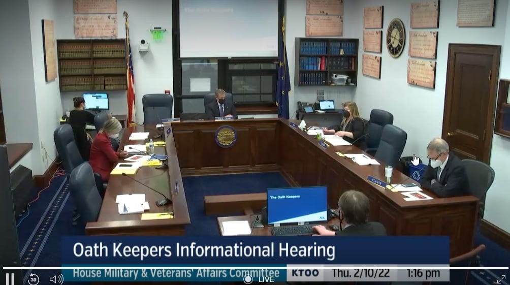 The House Military and Veterans’ Affair Committee held an informational meeting on the Oath Keepers on Thursday that was, frankly, a lot more interesting and useful than I was expecting. The committee is holding a series of meeting on the Oath Keepers following the chamber coming up short of the votes needed to strip Rep. David Eastman, who is a member of the group whose leaders have been convicted indicted on seditious conspiracy, from his committee assignments. While the committee’s two presenters were firmly on the side of seeing the Oath Keepers as a dangerous, anti-government group, the committee’s chair Rep. Chris Tuck made it clear that the committee is interested in hearing its side of the story.
