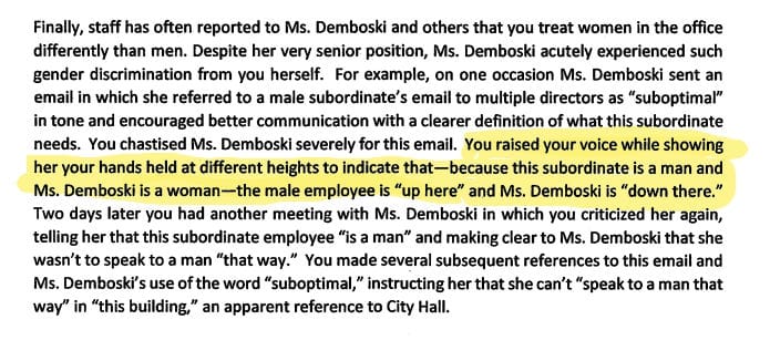 “You chastised Ms. Demboski severely for this email,” the letter explains. “You raised your voice while showing her your hands held at different height to indicate that—because this subordinate is a man and Ms. Demboski is a woman—the male employee is ‘up here’ and Ms. Demboski is ‘down here.’ Two days later you had another meeting with Ms. Demboski in which you criticized her again, telling her that this subordinate employee ‘is a man’ and making clear to Ms. Demboski that she wasn’t to speak to a man ‘that way.’”