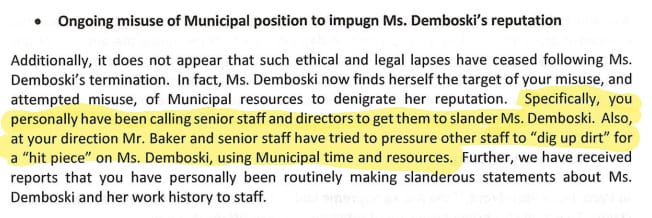 A full page is dedicated to issues with HR and a hostile work environment for women, including several nasty exchanges with Demboski. It didn’t stop there, though, and extended to an apparent effort to intervene in the municipal prosecution of Brandon Spoerhase (the guy with the shady real estate deals and a connection to Larry Baker) for a string of domestic violence crimes.