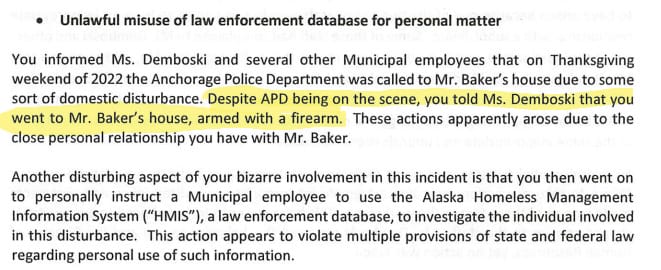A Bronson ally attempted to steer a “significant” contract to a friend, which included cornering one of the people on the steering committee and telling her she needed to “swing” the contract to this friend. She didn’t and the unnamed friend didn’t get the contract, but that wasn’t the end of it. According to the letter, “At this point your close associate complained to you about the employee who chaired the RFP panel, and you had that employee terminated. … You subsequently acknowledged to Ms. Demboski that your close associate asked for the termination, so you called the Human Resources director (that’d be Nikki Tshibaka) and asked him to arrange it.” This happened in August 2021, and it doesn’t appear to have resulted in action against the city, but per the letter, “Following this occurrence, you acknowledged to Ms. Demboski on several occasions that you made a mistake and should have never directed this termination.”